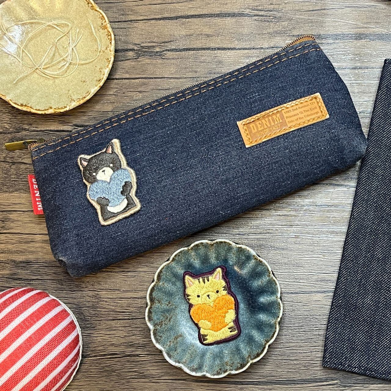 ハートを抱えるネコ 黒白 手刺繍ブローチ