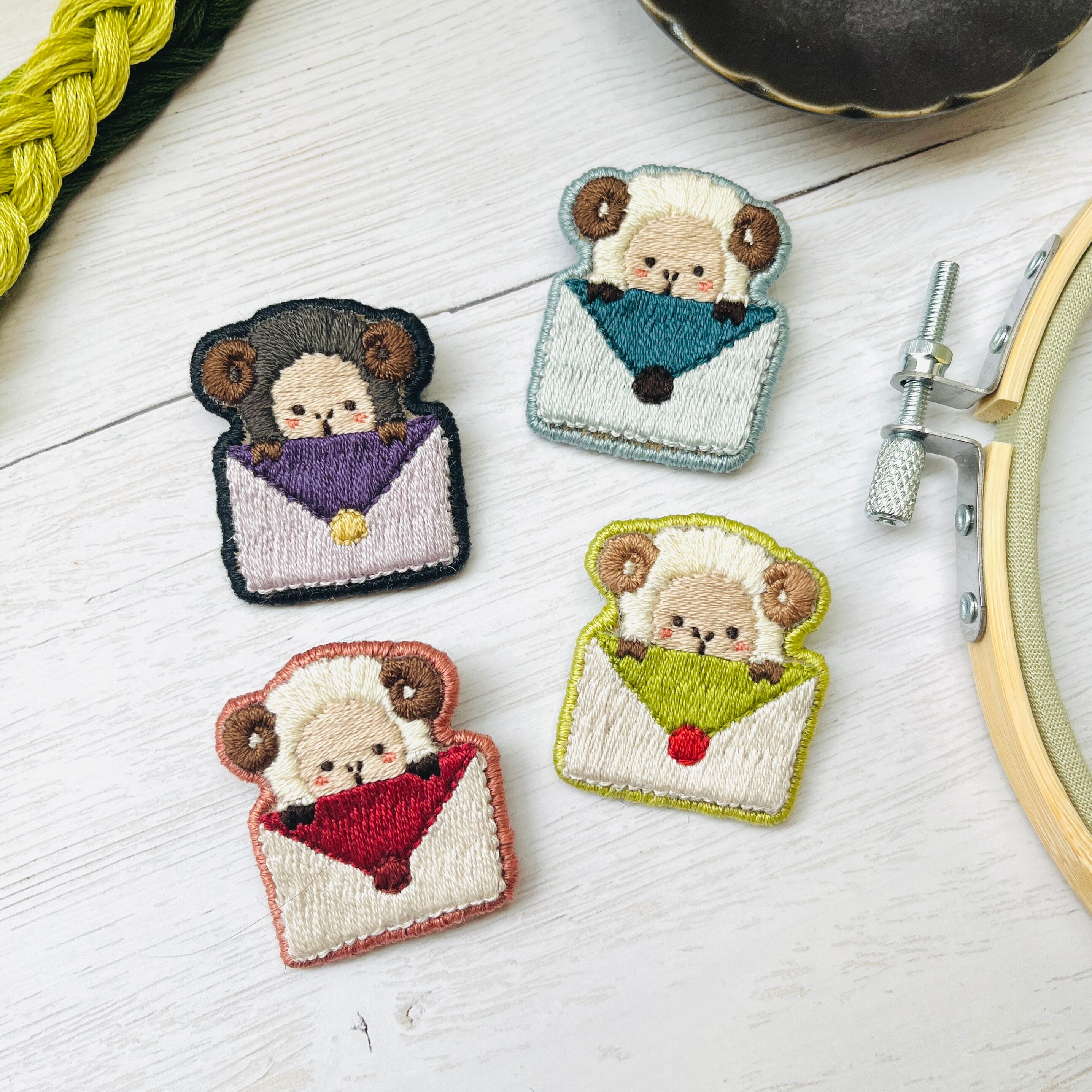 ひつじさんのお手紙ブローチ Blue 手刺繍ブローチ