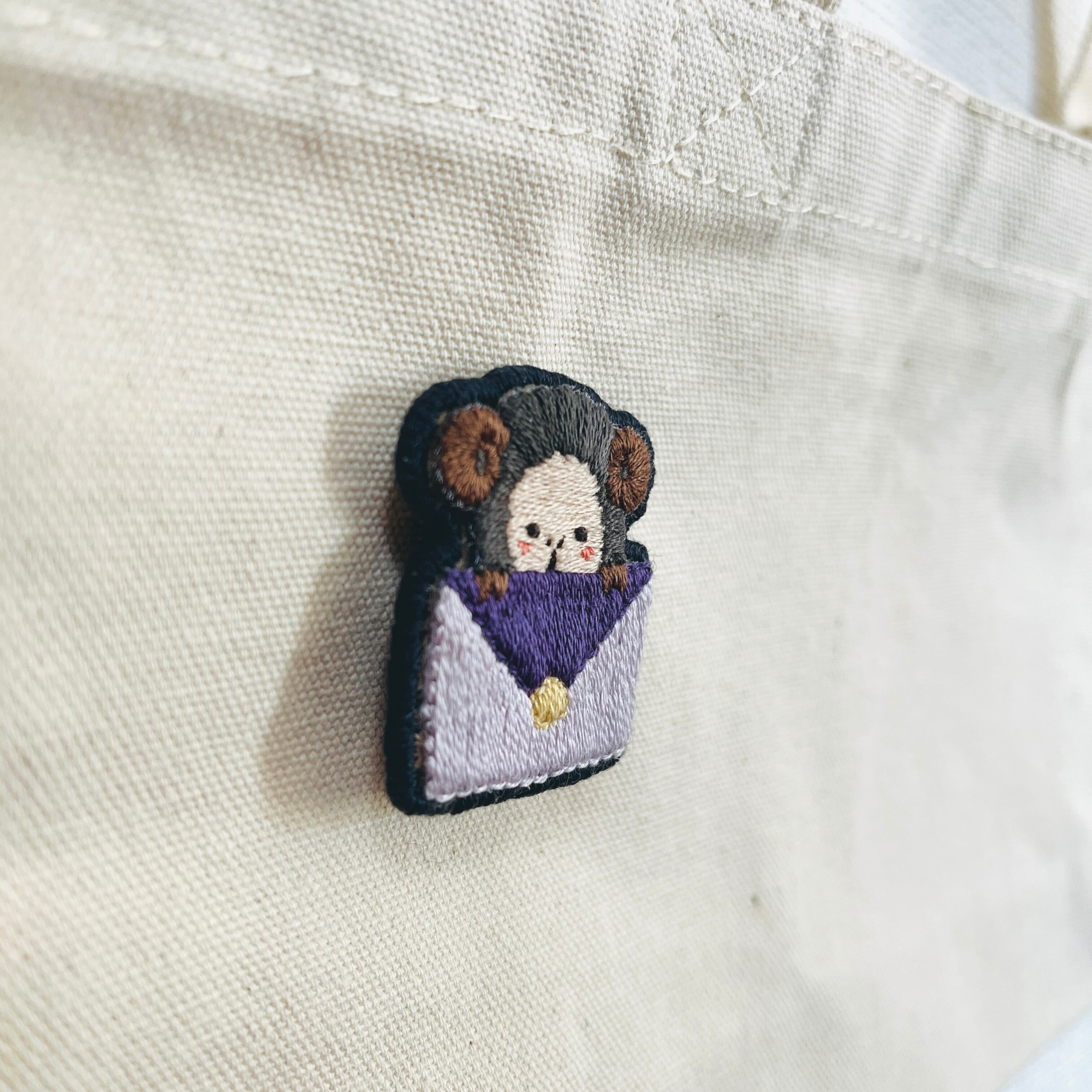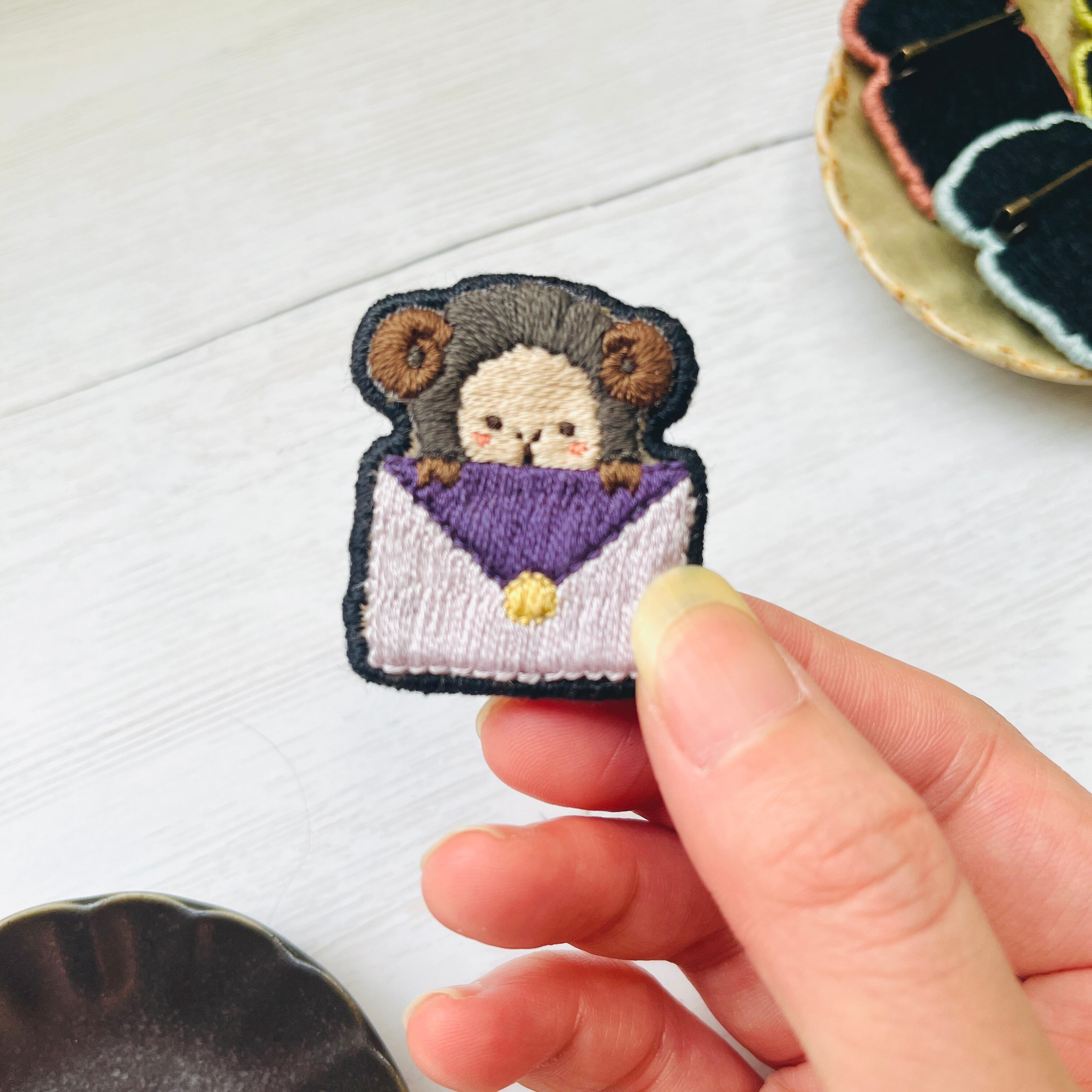 ひつじさんのお手紙ブローチ Purple 手刺繍ブローチ