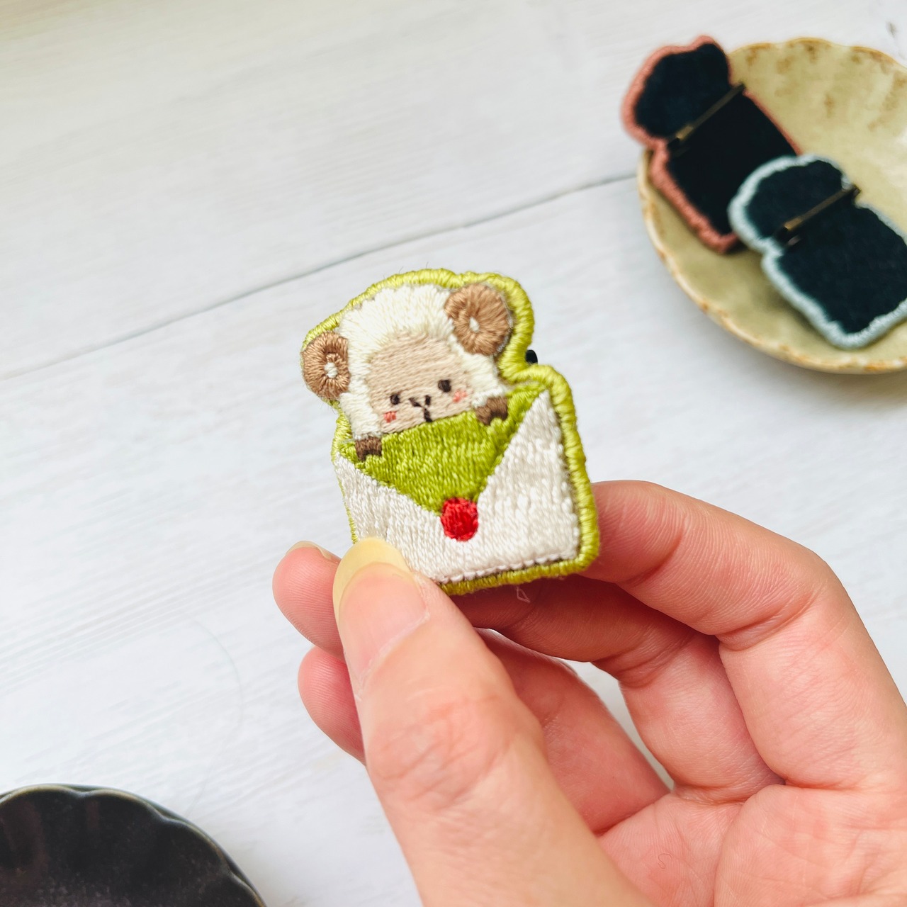 ひつじさんのお手紙ブローチ Green 手刺繍ブローチ